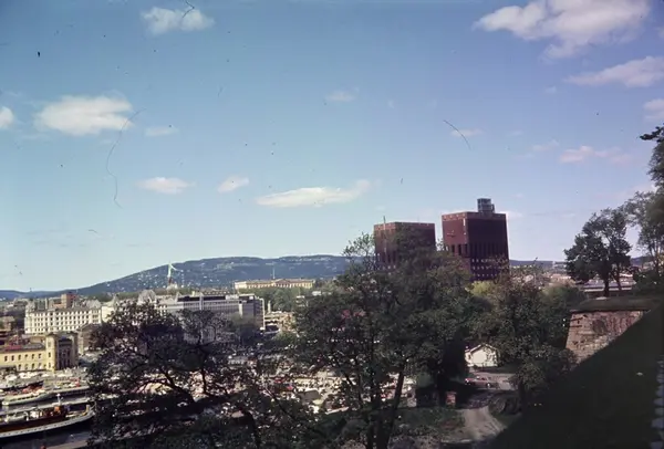 Akershus festning, utsikt, havn, båter, Vestbanestasjonen, Rådhuset, kontorbygninger