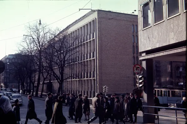 gateløp, gatekryss, mennesker, kontorbygninger, Stortingsbygningens tilbygg mot Akersgata, trikk