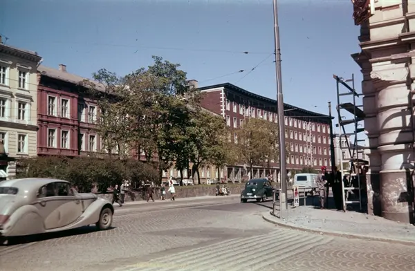 Hjørnet av Det engelske kvarter ved Observatoriegata helt til høyre i bildet. Bilen til venstre er en Jaguar Mark V eller VII 1949-54.