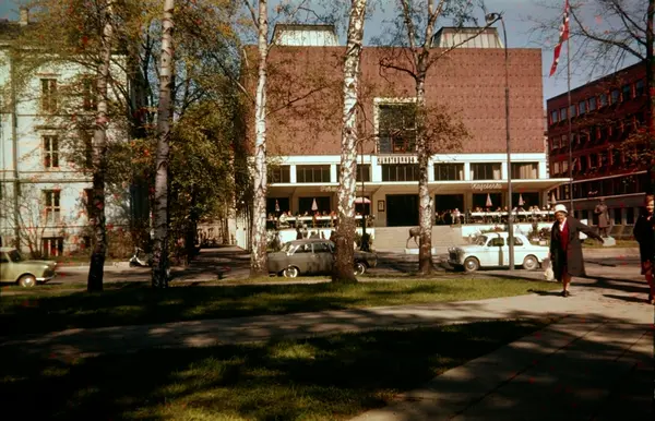 park, mennesker, gate, Kunstnernes Hus, terrasse, restaurant, skulpturer, flagg, Lektorenes Hus, bygård, biler