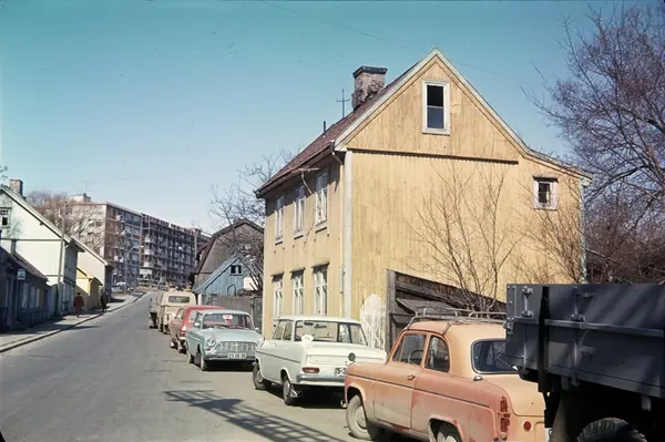 gateløp, trehusbebyggelse, biler, boligblokker