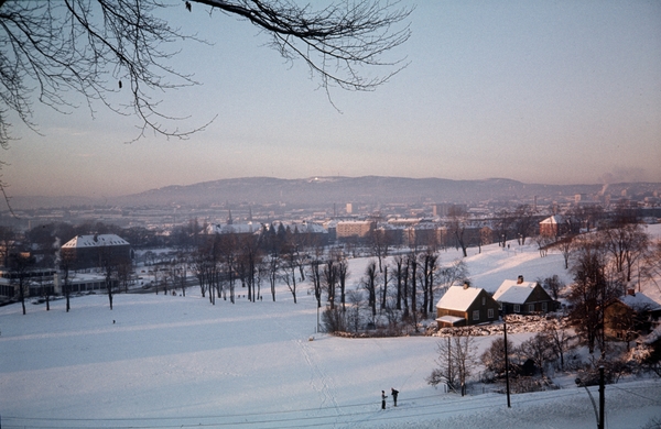 utsikt, park, barn på ski, Tøyen gårds østre portstuer, Munchmuseet, Botanisk museum, Bellevue løkke, blokkbebyggelse, snø