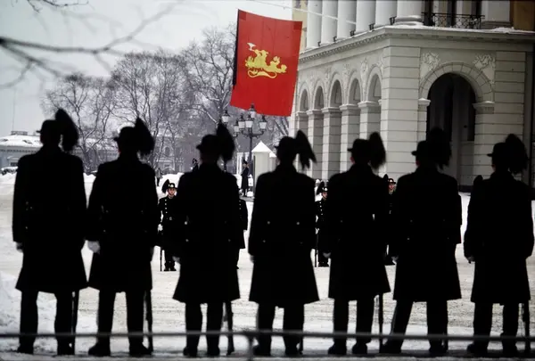 Slottet, kongebanner på halv stang, sørgeflor, gardister, snø
