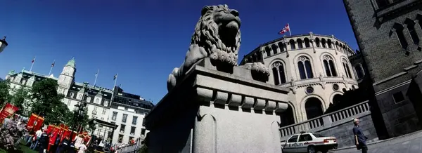 Stortingsbygningen, løveskulptur, mennesker, faner, Grand Hotel