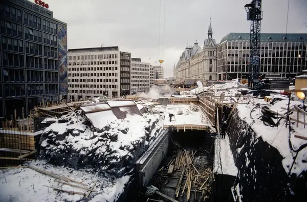 gateløp, anleggsarbeid, bygging av Nationaltheatret jernbanestasjon, anleggsarbeidere, tunnel, forskalling, kran, kontorbygninger, Victoria terrasse, snø