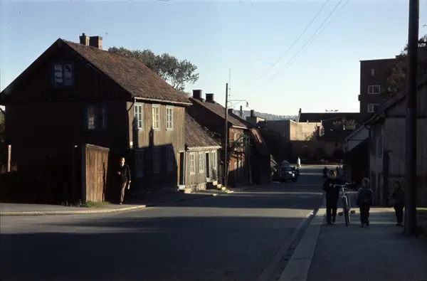 gateløp, trehusbebyggelse, mennesker, boligblokk