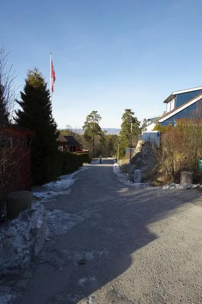vei, snøflekker, hager, rekkehus, flaggstang, vimpel