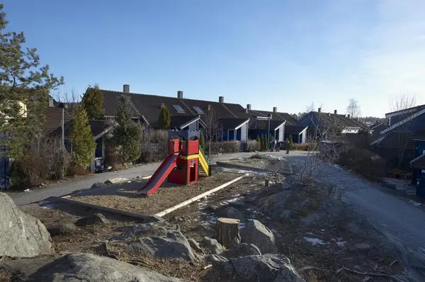 lekeplass, sandkasse, lekeapparat, veier, hager, rekkehus, barn