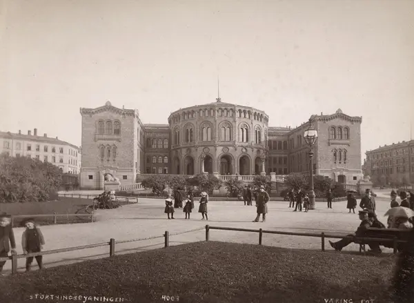 Stortingsbygningen, park, mennesker, forretningsgårder, gatebelysning