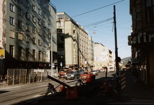gateløp, forretningsgårder, veiearbeid, biler, mennesker