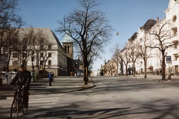 gateløp, bygårder, Frogner kirke, mennesker, syklist, trær