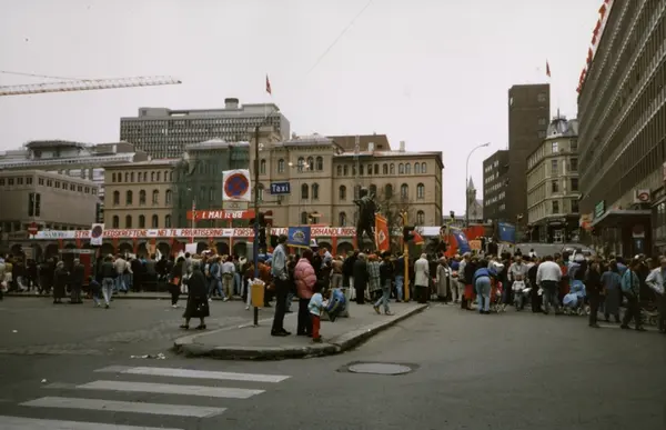 torg, mennesker, 1. mai-tog, Folkets Hus, kontorbygninger, regjeringshøyblokken, Hovedbrannstasjonen, kran