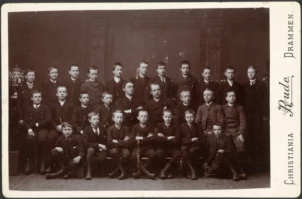 Første rad: Ludvig Aubert, Victor Plathe, Gustav Boeck Krog, Adolf Baastd, Carsten Dedekam, Johannes Lindstrøm, Kristian Andersen Aars, Kristen Heiberg, Edvard Steineger, Thorvald Backe Annen rad: Harald Thygesen, Ole Gulbrandsen, Ditlef Faye, Goggen Erichsen, cand. theol. Haakon Arnesen, klasseforstander Myhre, Arent de Besche, Gjerstad (? - vanskelig lesbart), Herman Christiansen. Tredje rad: William Johannesen, Adolf Eger, Alf Jensen, Einar Woxen, Sverre Halvorsen, Sverre Sandberg, Olaf Olsen.