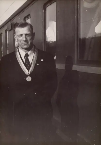 Bryteren Trygve Andersen, som senere tok navnet Byman, ankommer Østbanestasjonen etter å ha vunnet bronse i verdensmesterskapet i Stockholm i 1950.