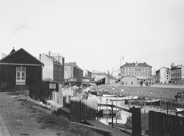 elv, robåter, bru, torg, bygårder, fabrikkbygning, mennesker