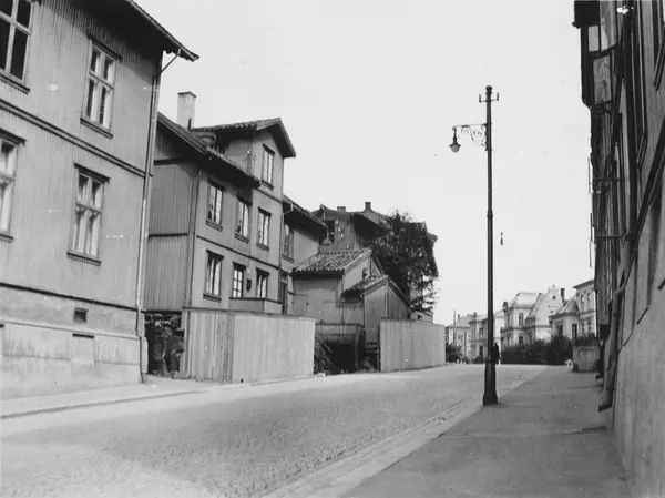 Ruth Børsum (1898-1977), giftet seg med bokhandler Gustav E. Raabe i 1930. Bebyggelsen nærmest langs venstre side av gaten ble revet like etter at bildet ble tatt, i august 1931.