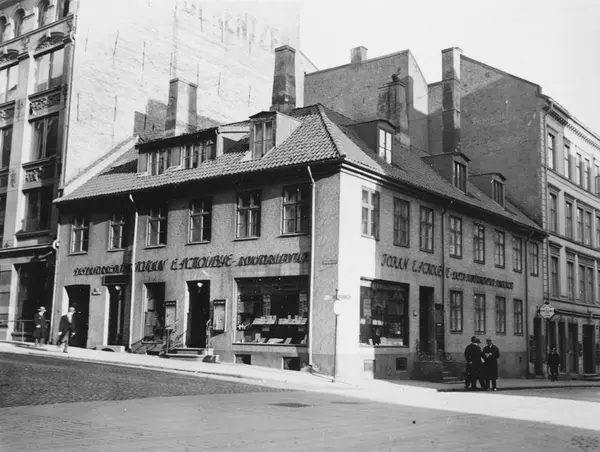 forretningsgårder, hjørnegård, Johan Schoubye papir og kontorutstyr, gavlvegger, mennesker
