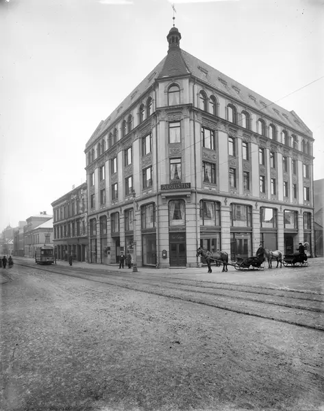 forretningsgårder, hjørnegård, Hotel Augustin, hester, sleder, mennesker, trikk