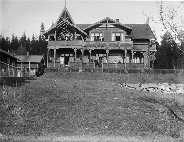 Maridalen Turisthotell, hovedhus, veranda, mennesker, hage