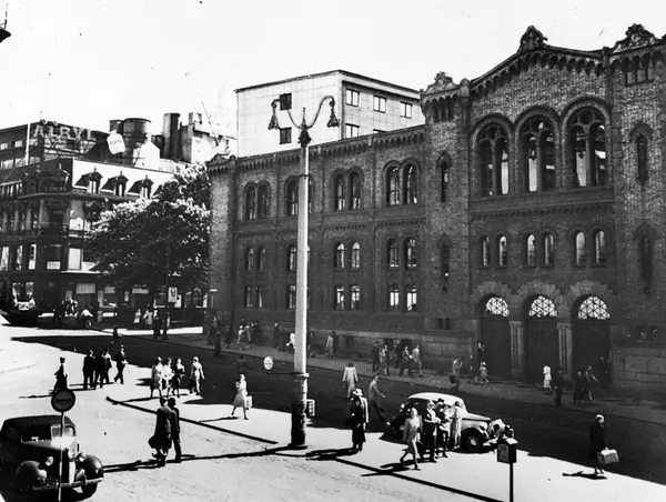 gate, biler, mennesker, gatebelysning, Stortingsbygningen med inntegnet forslag til påbygg, forretningsgård