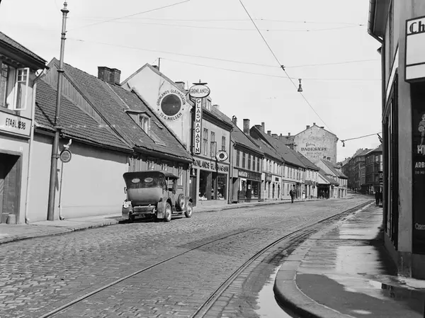 gateløp, trikkeskinner, brostein, trehusbebyggelse, forretningsgårder, bygårder, bil, mennesker