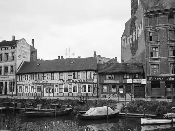 elv, båter, forretningsgårder, bindingsverk, trehus