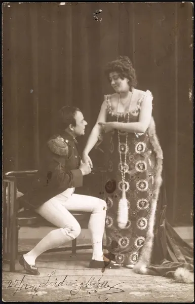 dobbeltportrett, mann, kvinne, skuespillere, rollebilde, "Madame Sans-Gêne" på Trondhjems Nationale Scene, sittende og stående helfigur, kostymer