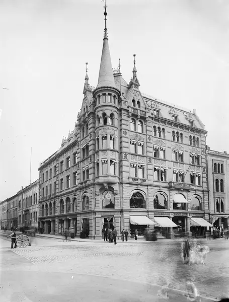 forretningsgård, hjørnegård, Hotel Westend, Den Norske Husflidsforening, Fotograf Gustav Borgens atelier, markiser, mennesker