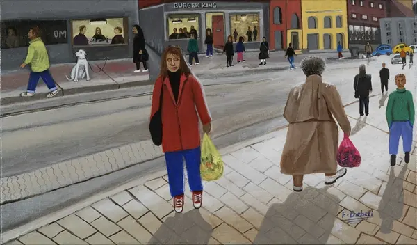 Bymiljø, mennesker, handleposer, brostein, fortau, trikkeskinner, kafe, hund, fasader