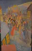 Torgslaget, med Kong Christian Fredrik lengst til venstre, Wedel-Jarlsberg, og folkemengde i midten, litt til høyre Henrik Wergeland, og lengst til høyre Constitutionen som seiler inn Bjørvika.