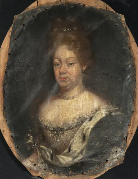 Maleriet er i veldig dårlig tilstand og er spent opp på trepaneler som ikke henger sammen. Oppbevares flatt.