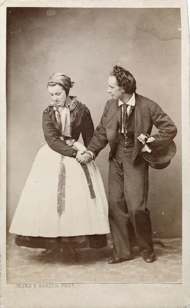 Julie Smith som Lisbet og Harald Paetz som Jokum i veaudevillen ”En søndag på Amager”, skrevet af Johanne Luise Heiberg og oppført på Det Kongelige Teater første gang 5. mars 1848 med fru Heiberg selv som Lisbet og Michael Wiehe som Jokum. Julie Smith og Harald Paetz overtok rollene i 1862. Paret, som ble gift i 1864, spilte rollene for siste gang 13. mai samme år.