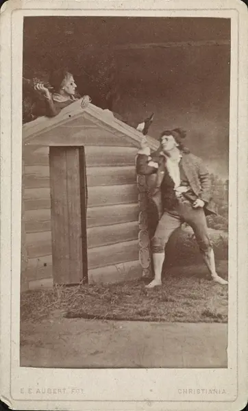 scenebilde, mann, kvinne, skuespillere, rollebilde, Peer Gynt og Mor Aase på Christiania Theater, stående og liggende helfigur, kostymer