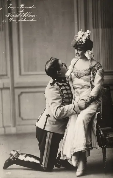 dobbeltportrett, mann, kvinne, operettesangere, rollebilde, "Den glade enke", sittende og knestående helfigur, kostymer