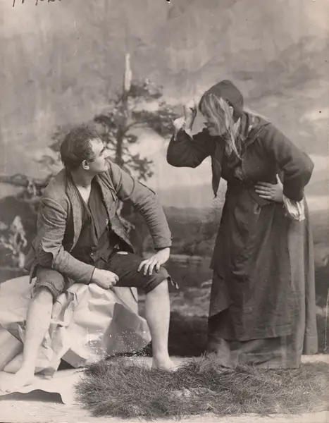 dobbeltportrett, mann, kvinne, skuespillere, rollebilde, tittelrolle og Mor Aase i "Peer Gynt" på Nationaltheatret, sittende og stående helfigur, kostymer