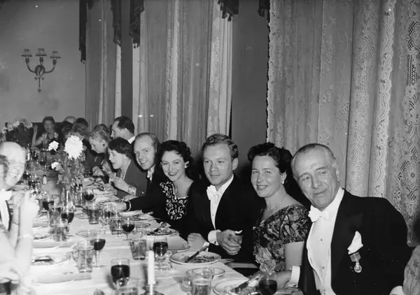 selskapslokale, selskap, langbord, oppdekning, middag, kvinner, menn, skuespillere