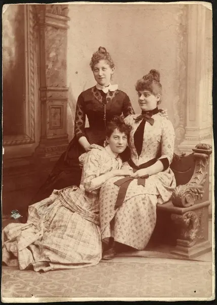 Johanne Voss sittende på gulvet, Signe Grieg til høyre og Johanne Dybwad bak. Disse tre var alle debutanter vd Den Nationale Scene i 1887, de var mye sammen og ble kalt "trekløveret".