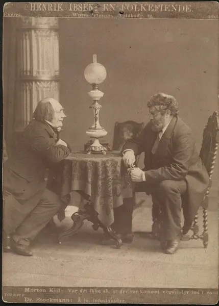 dobbeltportrett, menn, skuespillere, rollebilde, Morten Kiil og Thomas Stockmann i "En folkefiende" på Christiania Theater, sittende og stående helfigur, kostymer