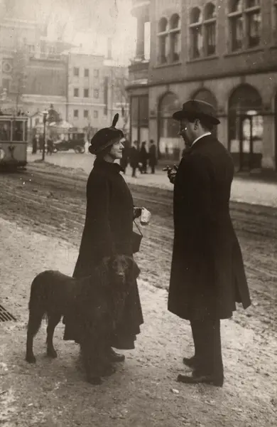 fortau, kvinne, mann, skuespillere, stående helfigur, hund, trikk, bil