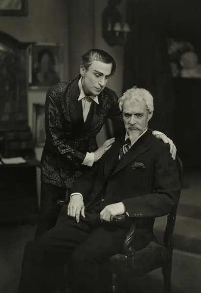 dobbeltportrett, scenebilde, menn, skuespillere, rollebilde, Knut Willberg og Thor Willberg i "Hustruen" på Nationaltheatret, stående og sittende helfigur, kostymer, scenografi