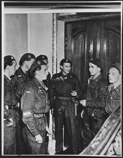 Oslogjengen (Milorgs aksjonsgruppe i Oslo) vokter Nationaltheatrets kongelosje ved festforestillingen 8. juni 1945, dagen etter kong Haakons hjemkomst fra England.