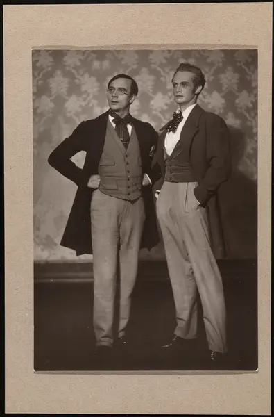 dobbeltportrett, menn, skuespillere, rollebilde, Lind og Falk i "Kjærlighetens komedie på Nationaltheatret, stående helfigur, kostymer