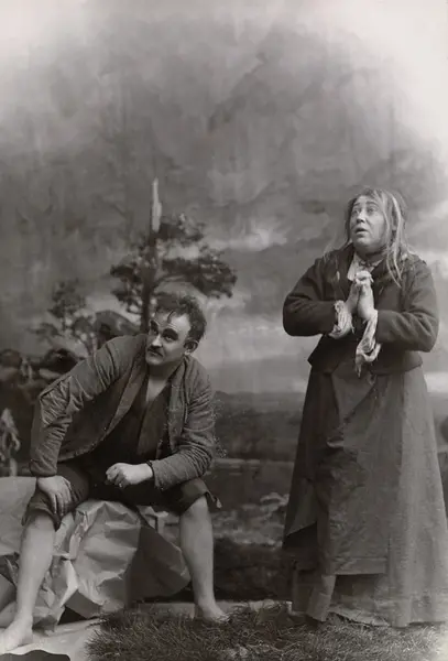 dobbeltportrett, mann, kvinne, skuespillere, rollebilde, tittelrolle og Mor Aase i "Peer Gynt" på Nationaltheatret, sittende og stående helfigur, kostymer