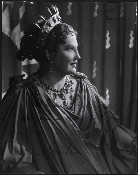 Påført hilsen til Lillebil Ibsen: "Dido" Mars 1953 Til kjære Lillebil som minne om Dido og din Kirsten. "Dido og Æeneas" opera fra 1689 av Henry Purcell. Rollen som Dido var Kirsten Flagstads avskjedsrolle på Det Nye Teater hvor den hadde premiere 19. februar 1953.