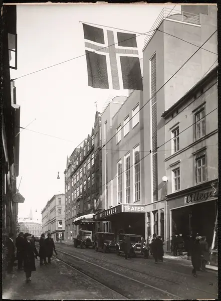 gateløp, Det Nye Teater, flagg, biler, mennesker, Bøndernes Hus