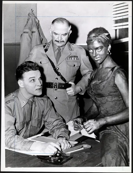 Fra venstre Rolf Søder som Pieter van Vlaanderen, Tore Foss som Kaptein Massingham og Marit Bolling som Stephanie.