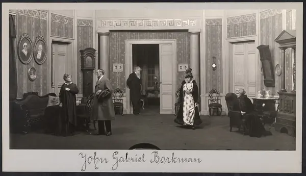 Fra venstre Ragna Wettergreen som Gunhild Borkman, Rolf Knudssøn som Erhart Borkman, Stub Wiberg som John Gabriel Borkman, Johanne Voss som Fanny Wilton og Aagot Didriksen som Ella Rentheim.