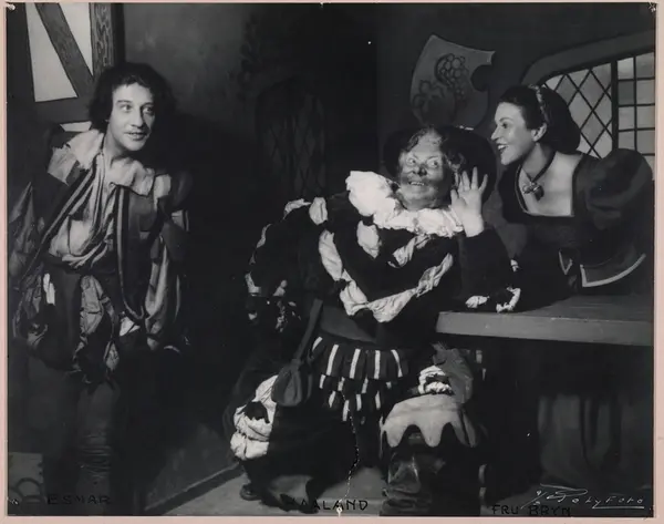 Fra venstre: Helge Essmar som Pistol, Ingjald Haaland som Sir Jon Falstaff og Tove Bryn som Madam Kvik.