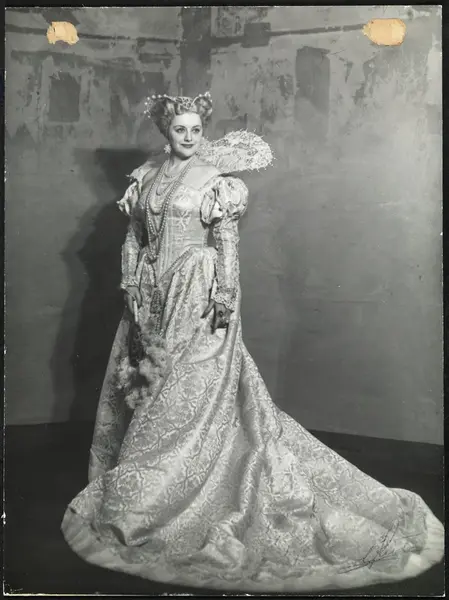 portrett, kvinne, skuespillerinne, rollebilde, tittelrollen i "Maria Stuart i Skottland" av Bjørnstjerne Bjørnson på Nationaltheatret, stående helfigur, kostyme
