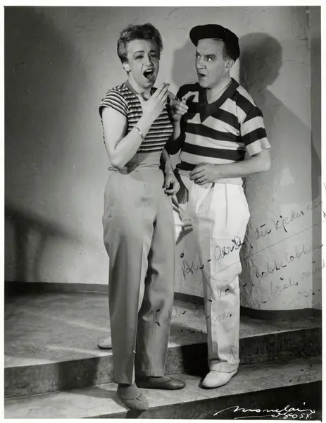 Edderkoppen teater, revy, dobbeltportrett, kvinne, mann, revyskuespillere, rollebilde, stående helfigur, kostymer